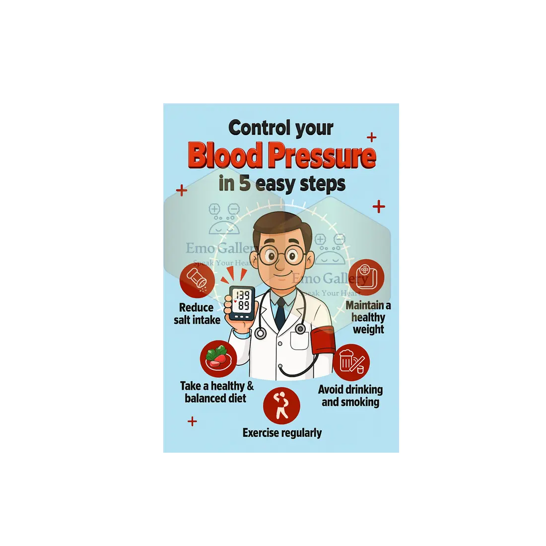 This Control Blood Pressure Poster visually explains five important steps that help individuals manage and reduce blood pressure naturally. It is designed for clinics, hospitals, pharmacies, wellness centers, gyms, schools, and public health awareness campaigns.