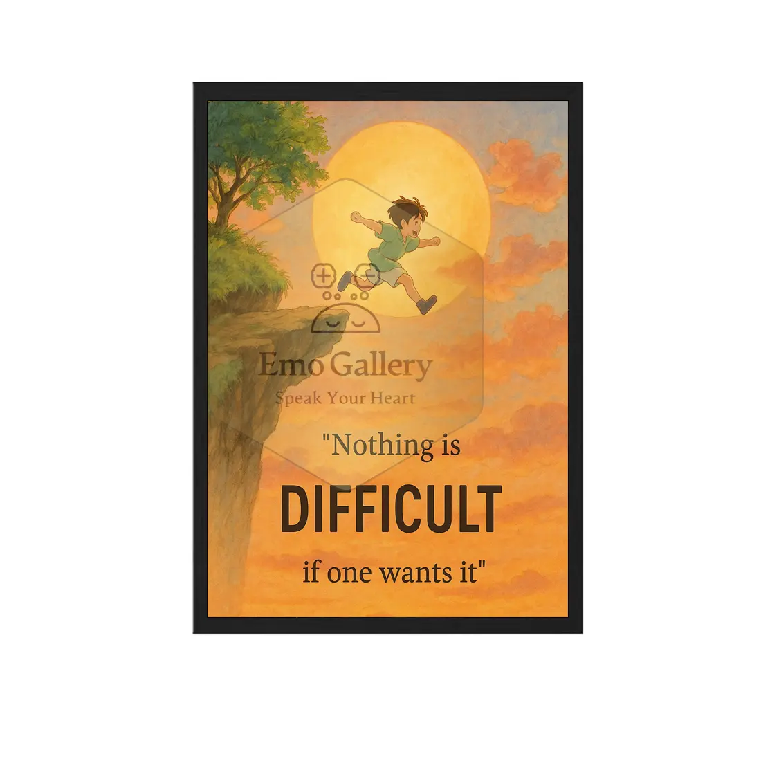 This powerful motivational frame is designed to inspire courage, determination, and a positive mindset. Featuring a stunning visual of a boy leaping across a cliff at sunset, it represents overcoming fear and taking bold steps toward success. The impactful “nothing is difficult quote” serves as a daily reminder that with strong willpower, anything is achievable.https://en.wikipedia.org/wiki/Motivation Whether you’re decorating your home or workspace, this inspirational wall art frame adds both meaning and beauty to your environment.