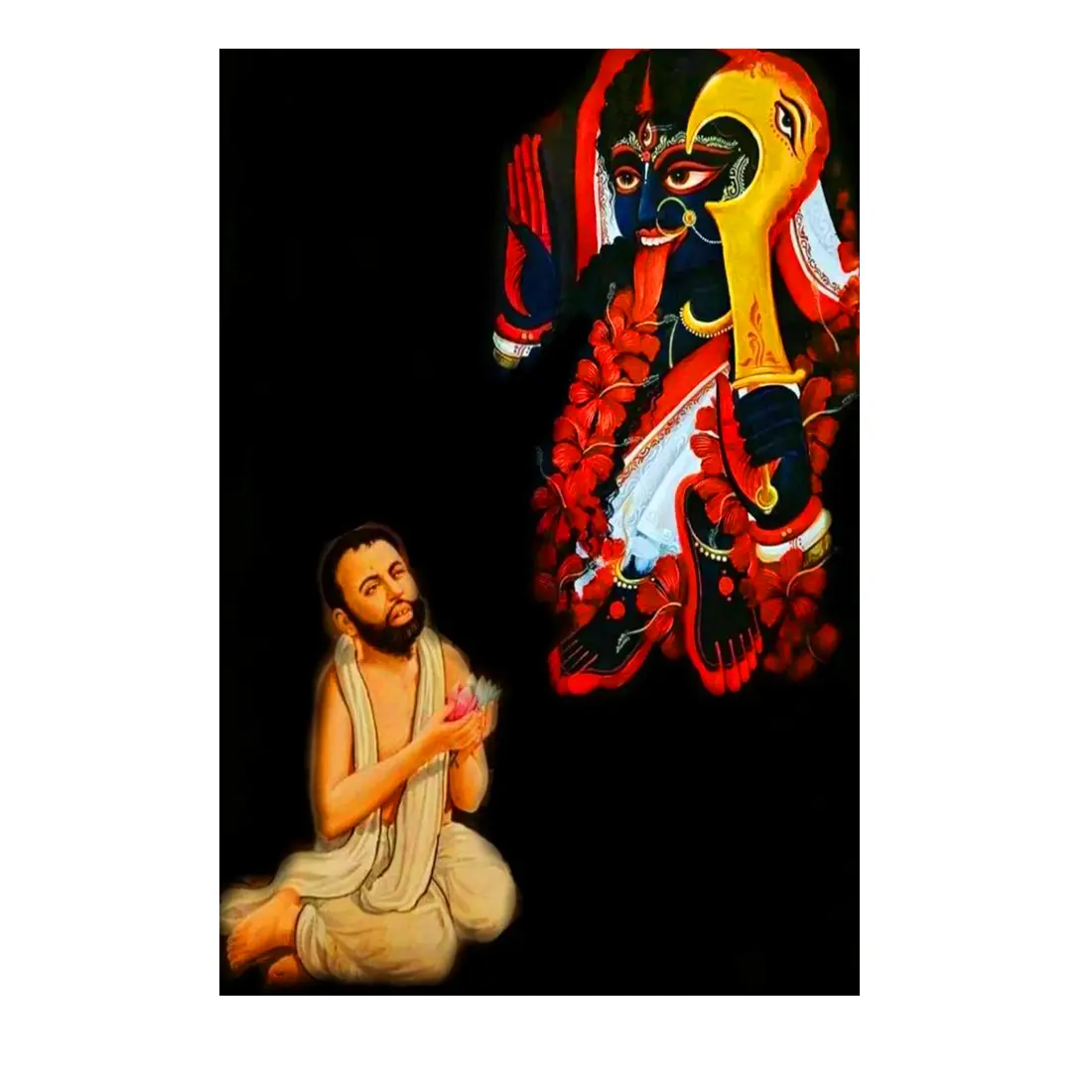 🕉️ Sacred Worship Scene – Depicts Paramhansa Ramakrishna Dev in deep prayer to Maa Kali, symbolizing devotion, surrender, and inner peace